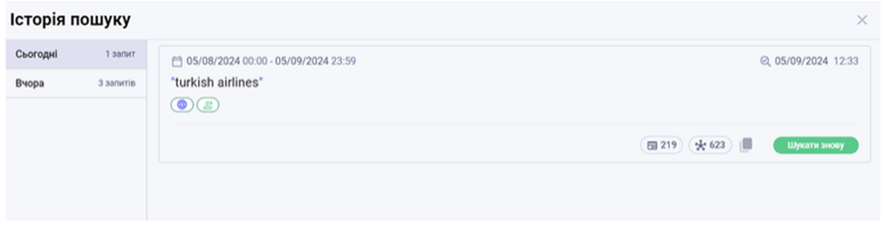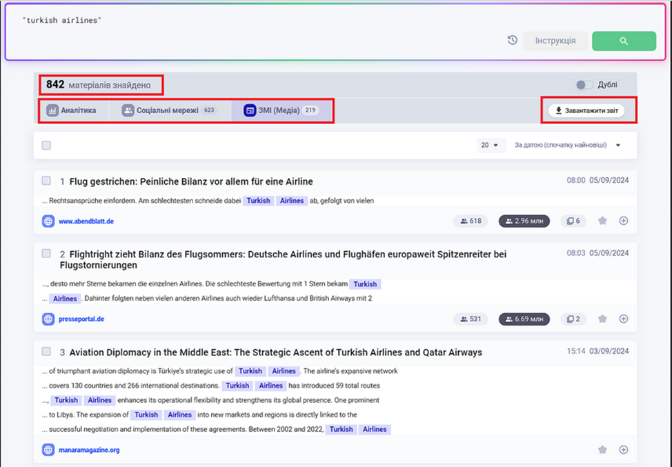 Результат пошукового запиту буде розміщений нижче. Зверніть увагу, що публікації з традиційних Медіа, Соц.мереж, а також аналітика розміщені окремо. Також за потреби ви можете завантажити звіт за знайденими публікаціями.