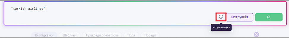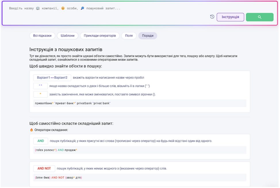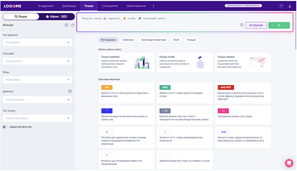 Інтерфейс пошуку призначений для пошуку по всій базі даних системи LOOQME, з ретроспективою до 1 року. У разі необхідності розширеної ретроспективи (понад 1 рік), можна звернутися до служби підтримки.