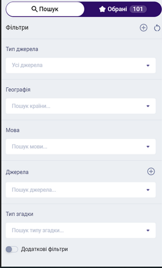 Далі необхідно обрати бажаний період в календарі та додаткові фільтри за потреби. В розділі пошуку ліворуч доступні фільтри за типами джерел, географією, джерелами та аудиторією, та ін.