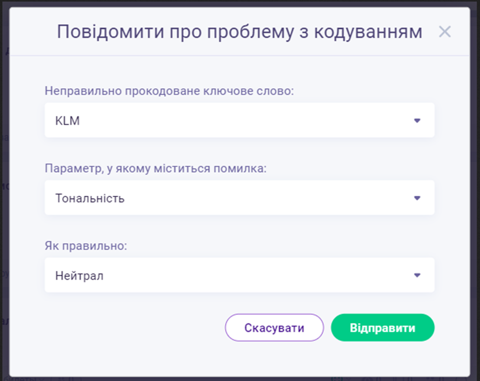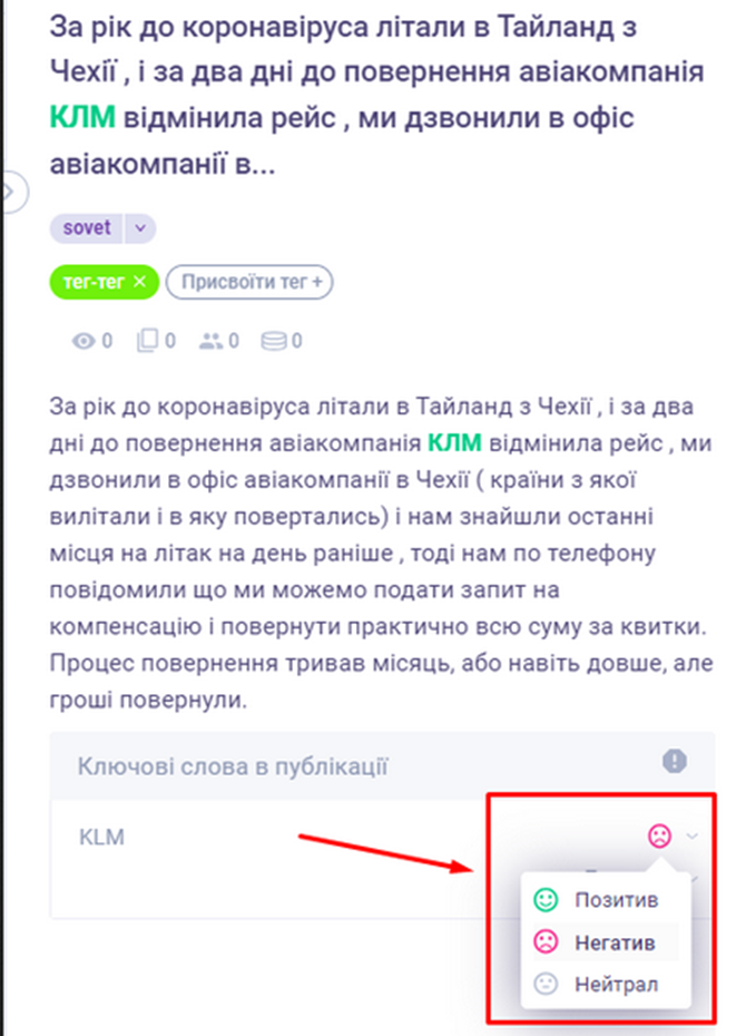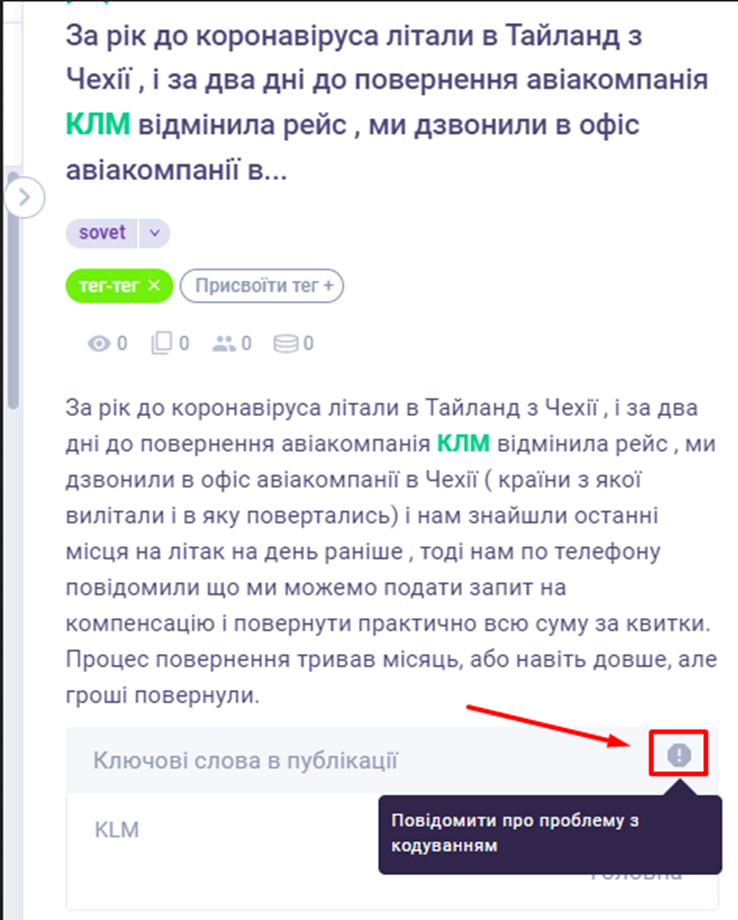 Якщо ви помітили, що публікації було присвоєно невірний параметр маркування як тональність або роль - під текстом новини є можливість повідомити про проблему.